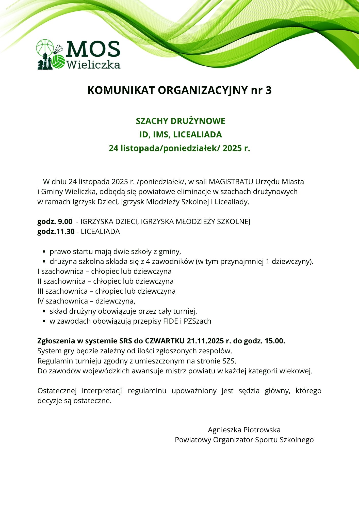 SZACHY DRUŻYNOWE Uczestnictwo 1. drużynę stanowią uczniowie jednej szkoły 2. drużyna składa się z 4 osób:– I szachownica – chłopiec lub dziewczyna– II szachownica – chłopiec lub dziewczyna– III szachownica – chłopiec lub dziewczyna– IV szachownica – dziewczyna,3. skład drużyny obowiązuje przez cały turniej.4. w zawodach obowiązują przepisy FIDE i PZSzach.5. do ostatecznej interpretacji niniejszego regulaminu upoważniony jest sędzia główny, którego decyzje są ostateczne.6. zaleca się wprowadzenie na każdym etapie rozgrywek kojarzenia komputerowego systemem ChessArbiter. KOMUNIKAT ORGANIZACYJNY